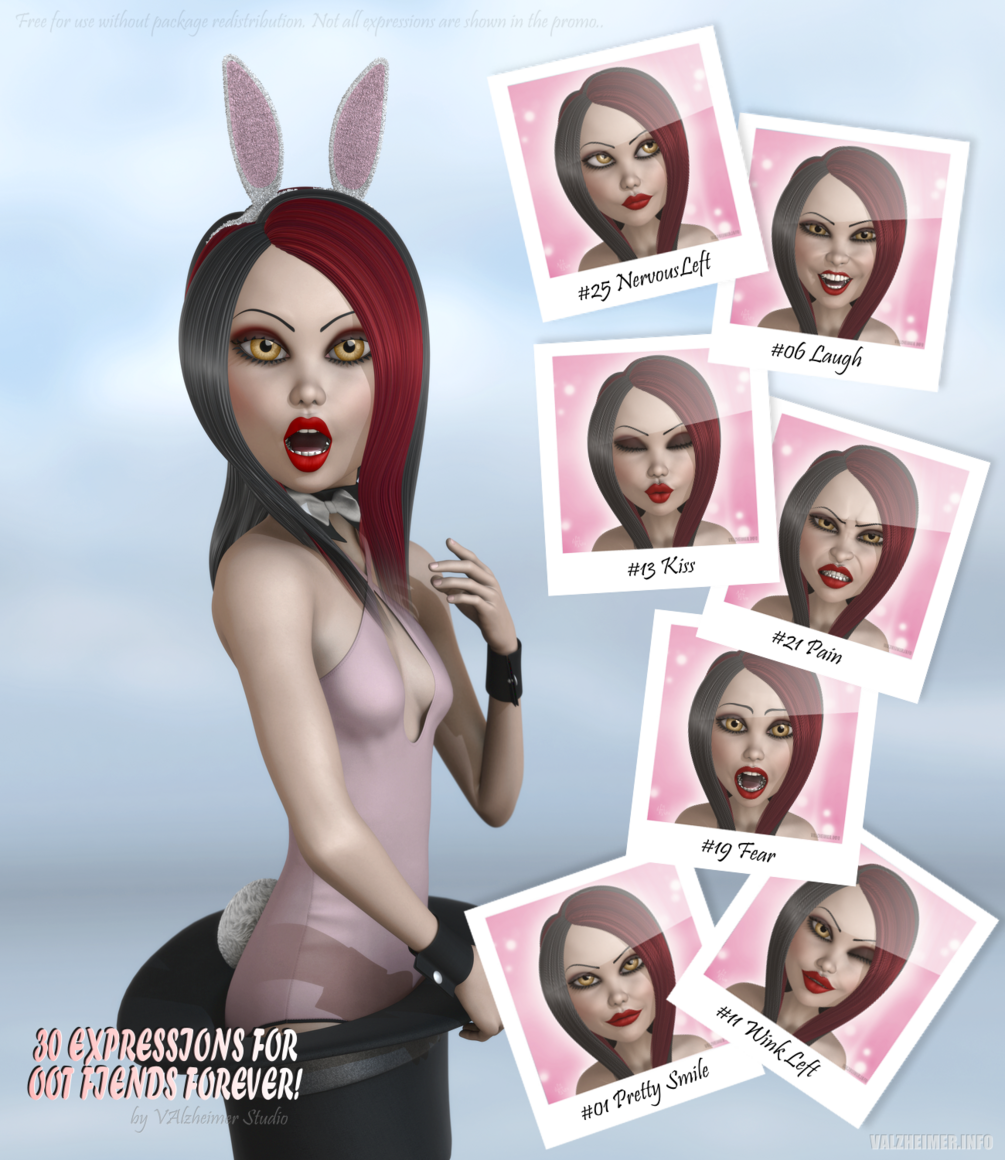 Created by VAlzheimer Studio, contains 30 expression presets + zero preset for Fiends Forever figure for Genesis 2 Female base by Out Of Touch. More information is available at http://www.valzheimer.info/2016/01/va2016-valzheimer-freebie-bonanza-2016.html
